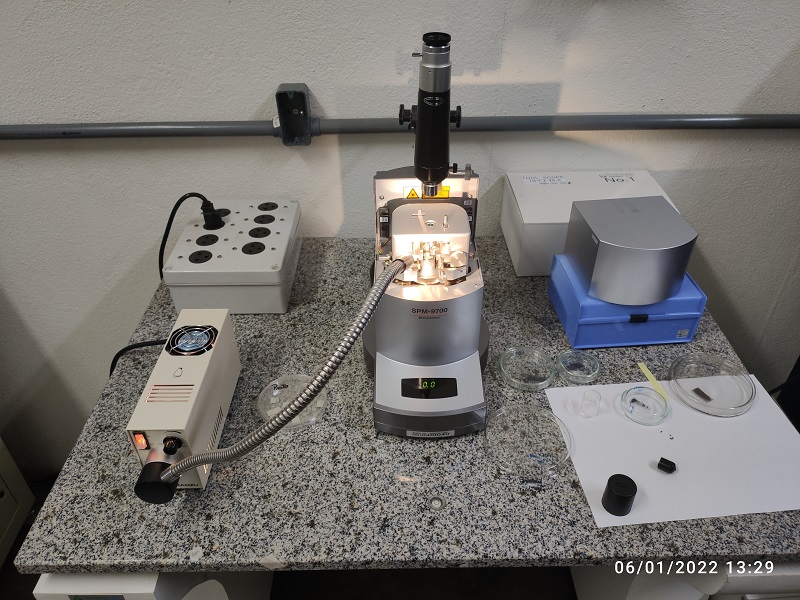 Ferramenta avançada usada para visualizar e mapear superfícies em escala nanométrica. Utiliza uma ponta extremamente fina para medir forças intermoleculares, gerando imagens tridimensionais de alta resolução de materiais biológicos, polímeros e superfícies sólidas. Essencial em pesquisas em nanotecnologia, ciência de materiais e biologia molecular.