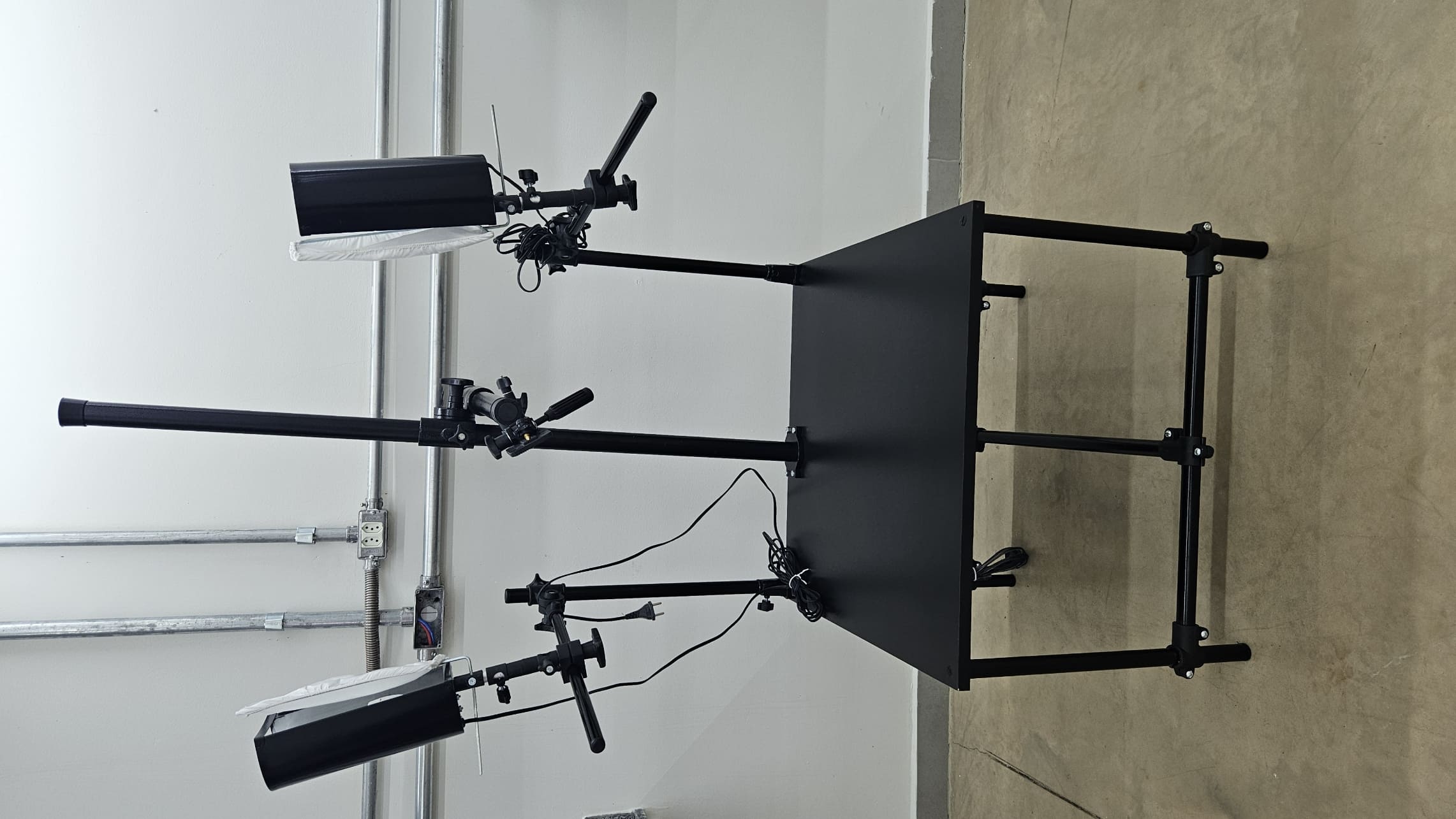 Mesa estativa com iluminação e suporte para máquina fotográfica